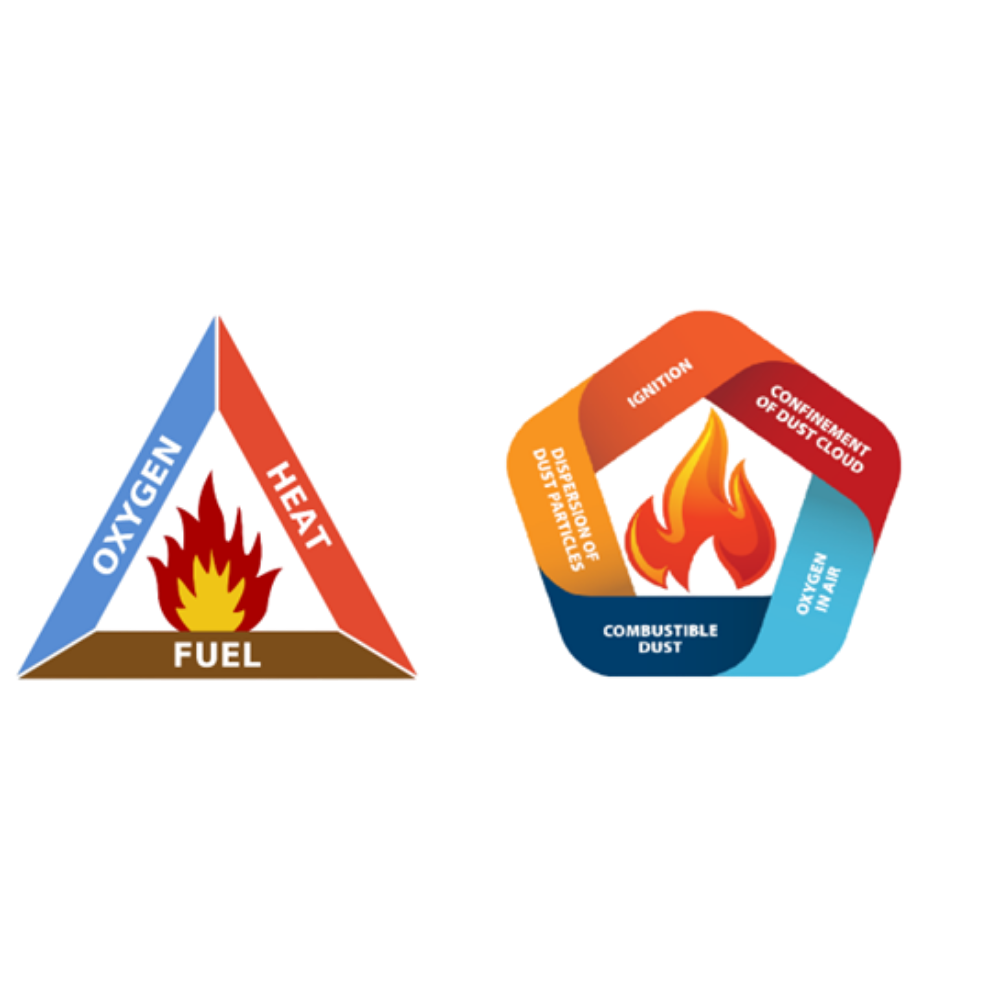 A robbanásbiztonság-technikai háromszög porok esetében ötszöggé alakul, azaz a porrobbanáshoz szükséges: